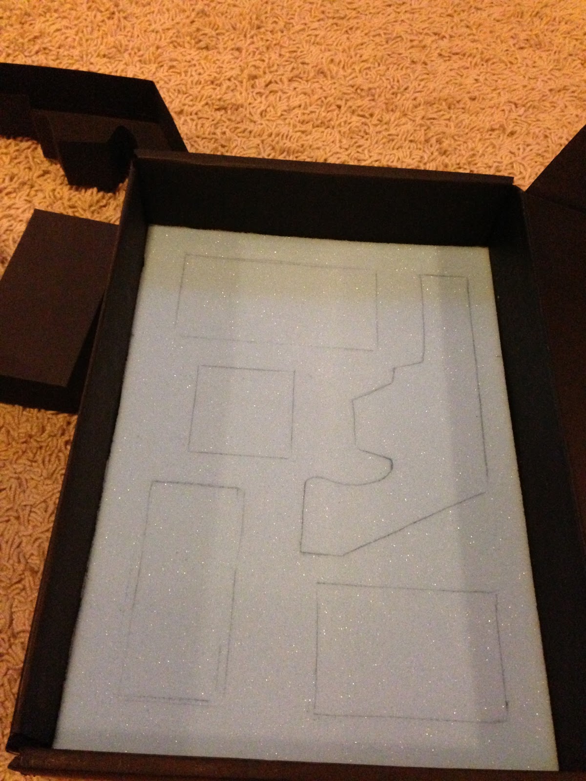 To have all these these boxes will have to fit in my box. To stop them from rattling around i decided to se them in some upholstery foam. To do this i set out the boxes in my preferred arrangement and drew around them. I then cut these shapes out.